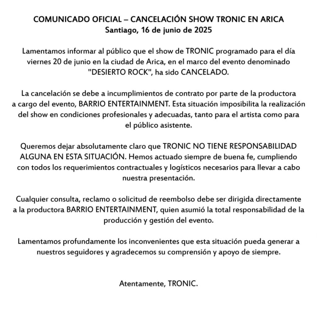 La banda nacional TRONIC ha anunciado hace unas horas, a través de sus redes oficiales, la cancelación de