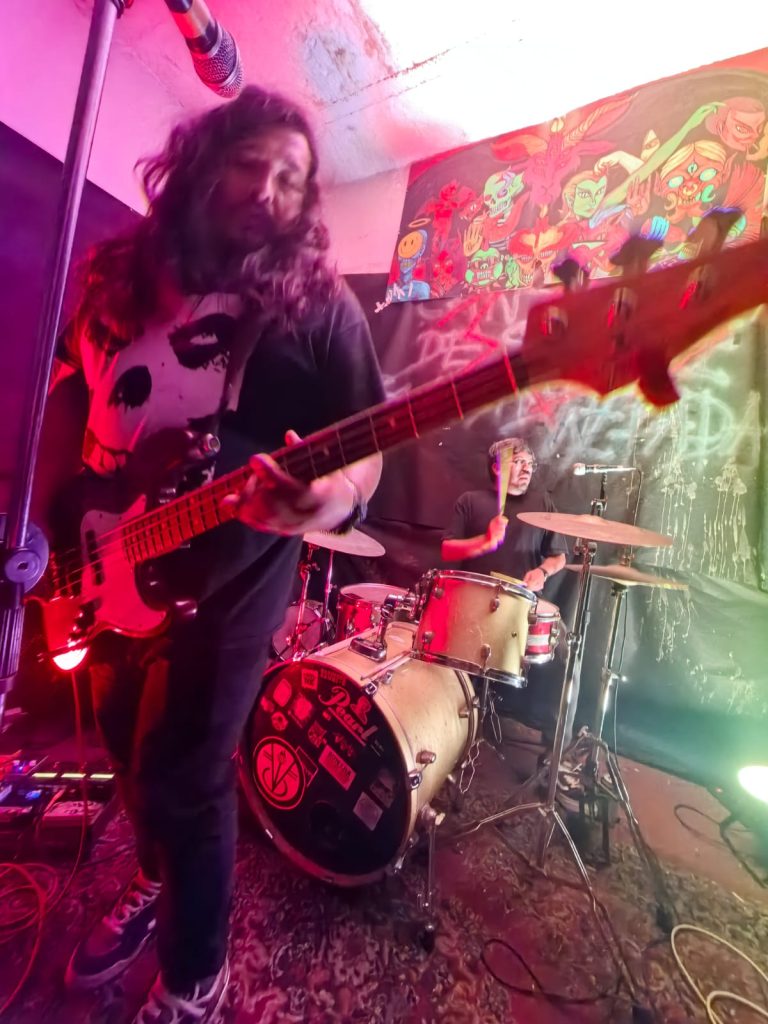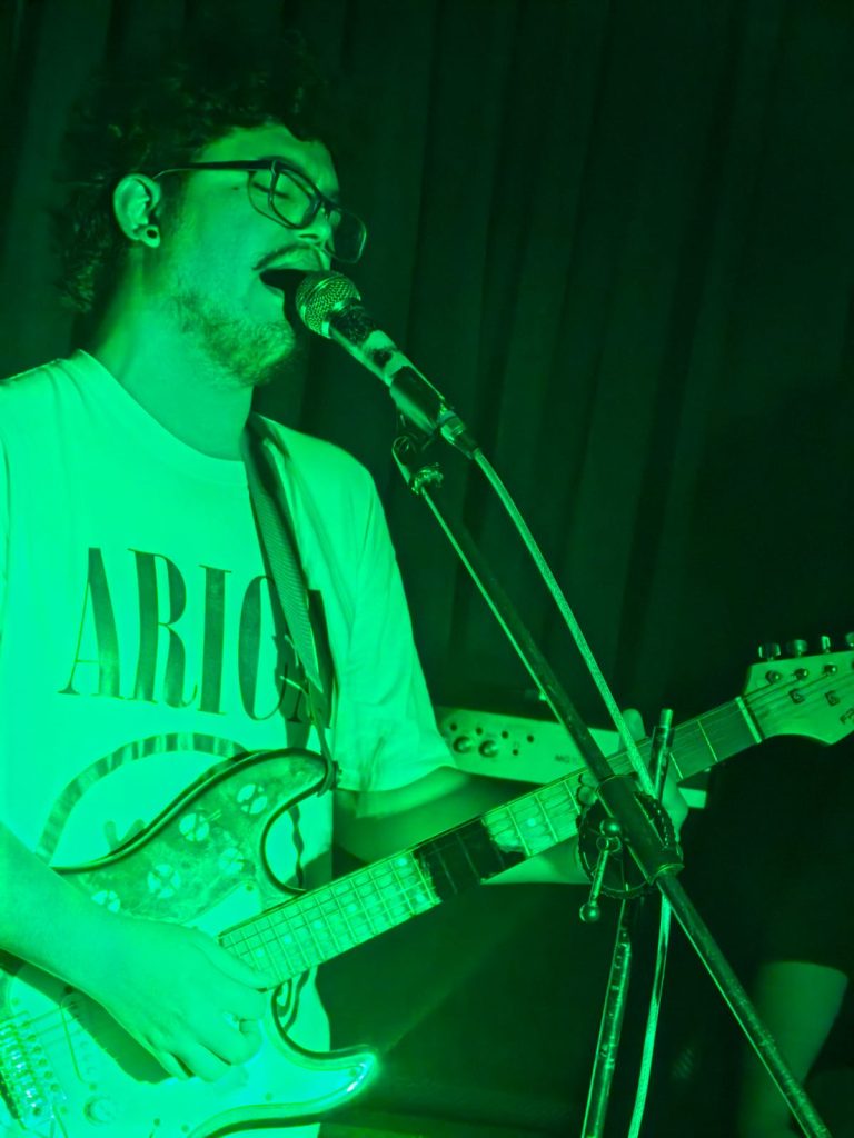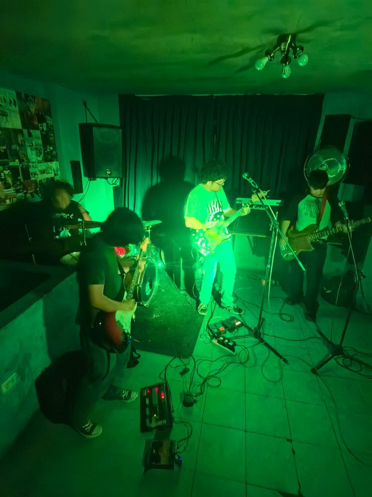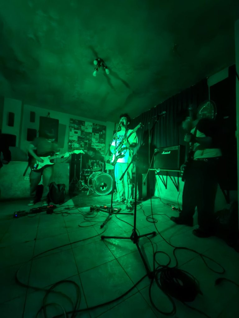 Finalmente llegó el turno de Brendan Jordan, quienes ofrecieron un show marcado por atmósferas profundas, reverb, delay y estructuras que se mueven entre el post punk y el dream punk. El vocalista y baterista Lemus asumió, como siempre, la doble misión de sostener el pulso y conducir la voz principal—aunque difícil, loejecuta con naturalidad. Los coros estuvieron a cargo del querido Sergio “Kashorro”, figura reconocida en la escena ariqueña, mientras que Marcos y Bryan completaron el viaje sonoro desde las guitarras.